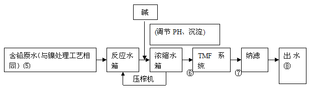 采用TMF與NF組合工藝,TMF帶自動反沖洗系統,每運行約20分鐘自動反沖洗10s左右,當TMF膜的能量衰減到300L/m2h則自動進行化學清洗,根據運行效果,大約每兩周進行化學清洗一次。當NF污染到一定程度,則自動進行化學清洗,運行中大約2-6月需化學清洗一次。經過處理后的水質需達到Pb濃度小于0.1mg/L,處理后廢水進入公司另建的生化處理系統,保證處理后排水達到(GB21900-2008)表3標準的要求。在⑤⑥⑦⑧四個點位取樣監測水質,其中:⑥可測反應水箱、濃縮水箱除去鉛的量;⑥ ⑦可測TMF系統除鉛量;⑦ ⑧可測納濾工藝除鉛量。