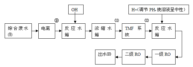 綜合廢水首先進行水質調理,然后進行電離處理,進一步再經TMF管式膜處理后經二級RO處理,保證公司總廢水量60%回用。濃水則進入公司另建的生化處理系統,保證處理后排水達到(GB21900-2008)表3標準的要求。在⑨、⑩、⑾、⑿、⒀五個點位取樣監測水質,其中:⑨ ⑩可測電離綜合廢水除污量;⑩ ⑾可測反應水箱、濃縮水箱除污量;⑾ ⑿可測TMF系統除污量;⑿ ⒀可測RO工藝除污量。