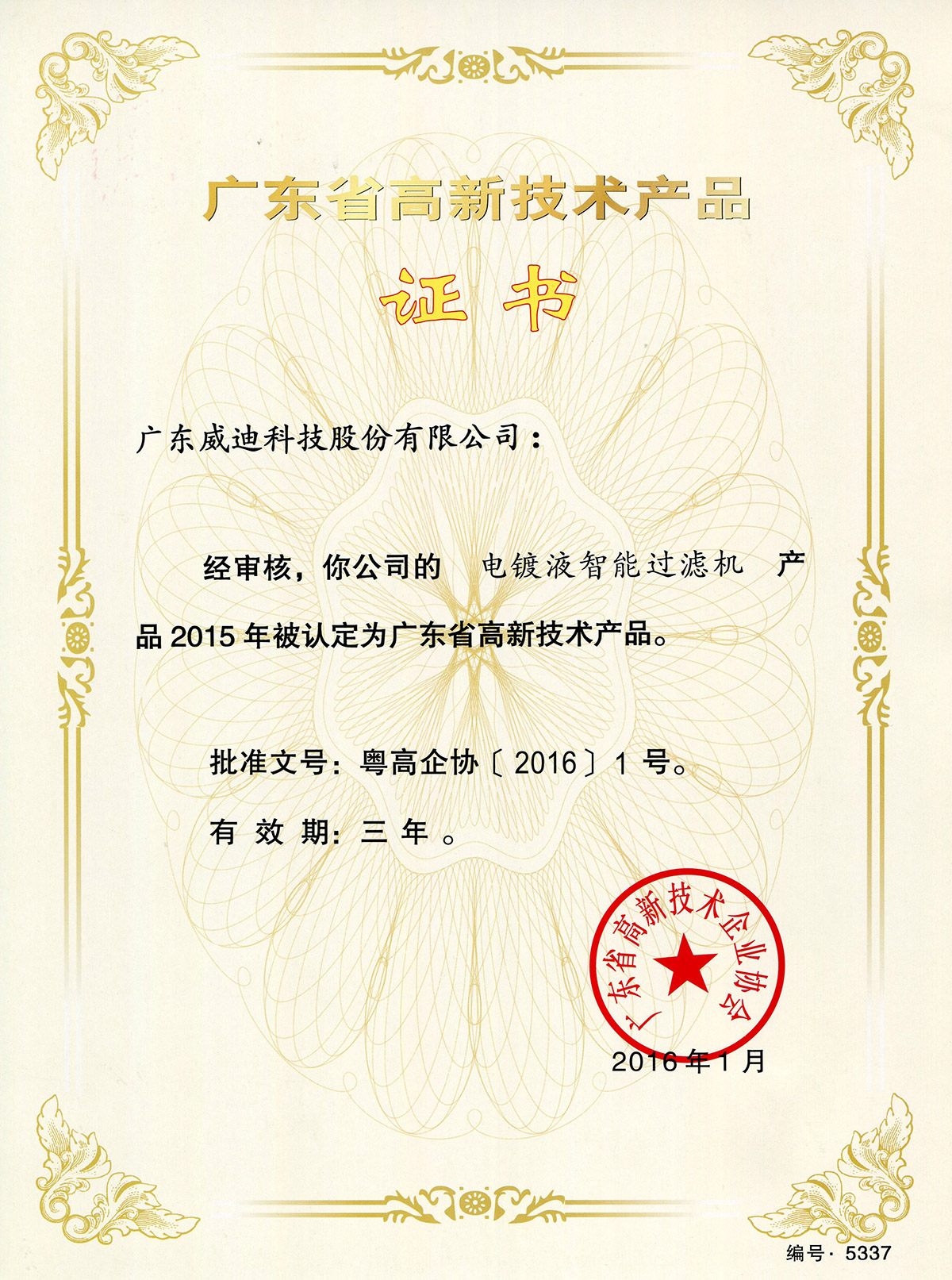 2015年廣東省高新技術(shù)產(chǎn)品-電鍍液智能過濾機(jī)
